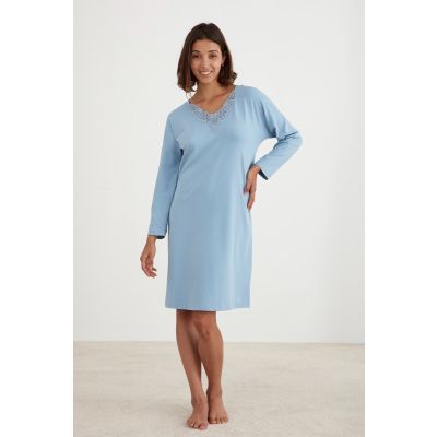 Lennie; this luxury jacquard light blue nightie features full length sleeves, knee length with neck lace detailing.