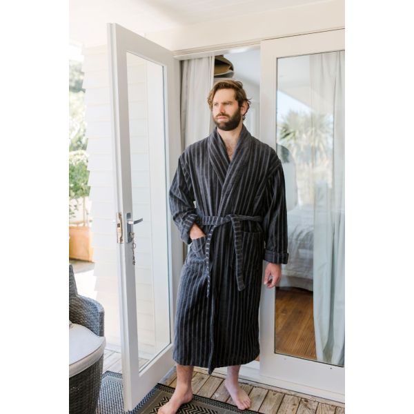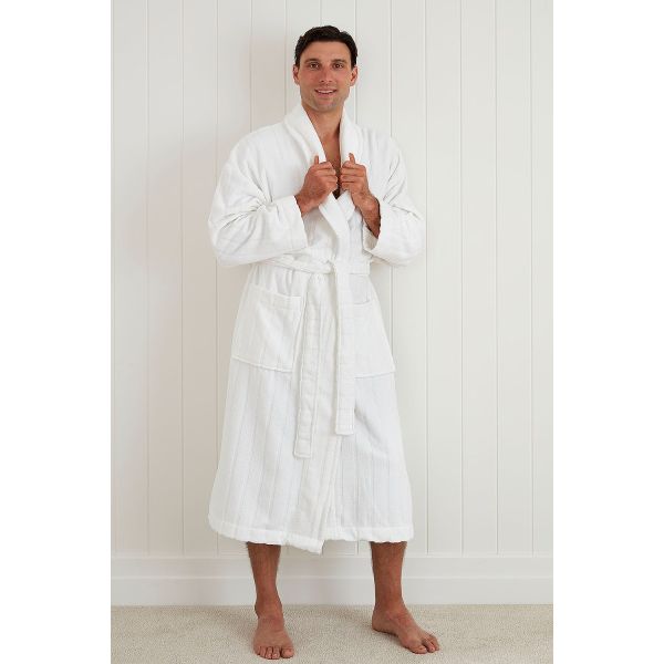 Luxury Hotel; this premium robe with stripe detailing allows for the hotel experience at home.