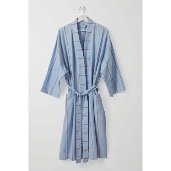 Harvey; this breathable and lightweight kimono style robe features dark blue stripes with white border detailing on a light blue background.
