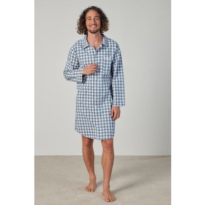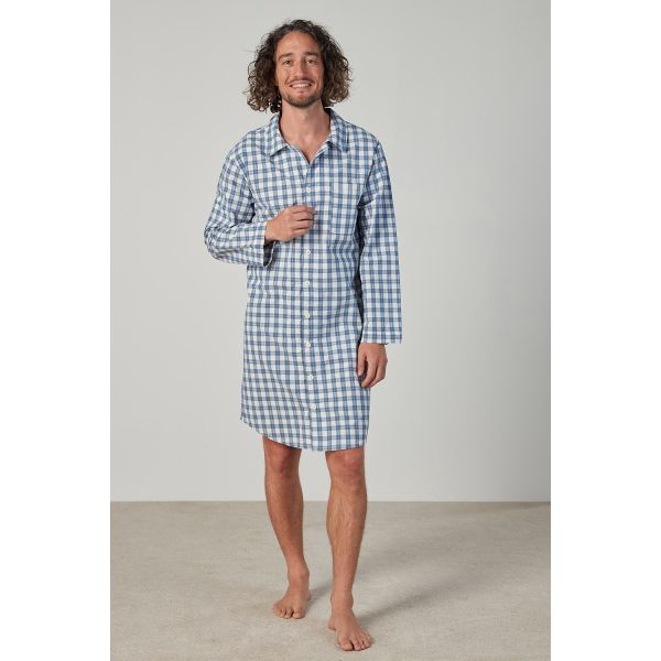 Hugo; this nightshirt features a button-down, long sleeve design with a traditional collar and breast pocket.