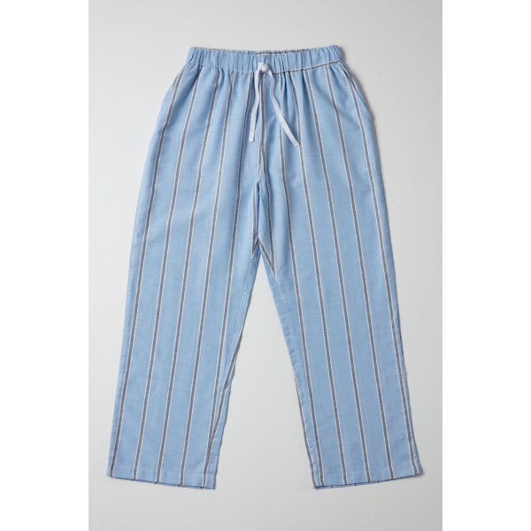Harvey; these lightweight pants with an elasticated waistband, drawstring and pockets features dark blue stripes with white border detailing on a light blue background.
