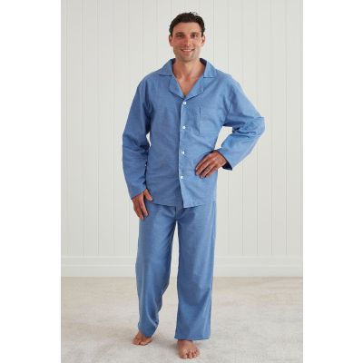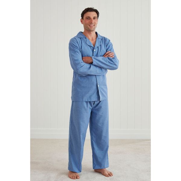Theo; this sophisticated classic pyjama set features a long sleeve button-up top and pants with an elasticated waistband.