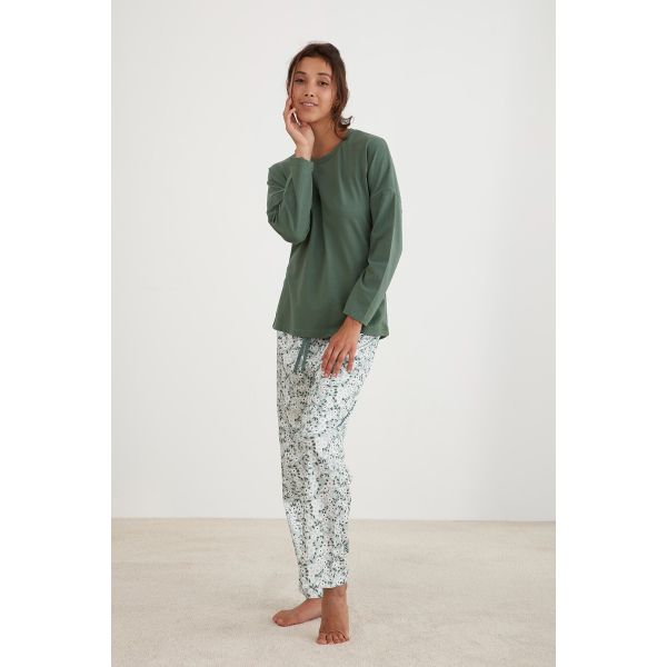 Chloe; this fashion green fine floral print casual set features a long sleeve stretch knit top and pants with an elasticated waistband and drawstring.