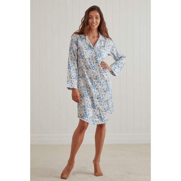 Mila; this lightweight, Mediterranean patterned nightshirt features a a long sleeve design with a button-up front.